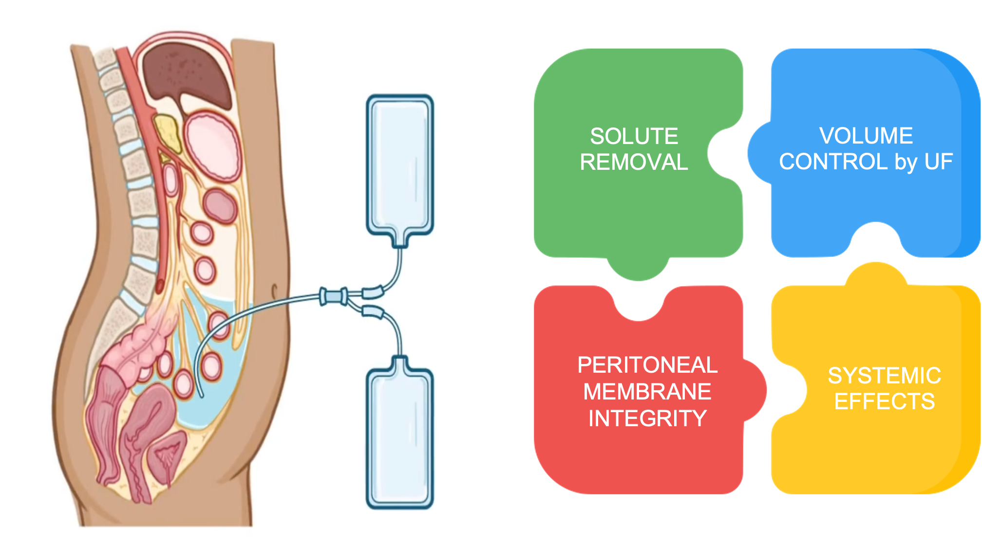 Figure 1.Peritoneal dialysis fluids serve solute removal and ultrafiltration. PD fluids also affect peritoneal membrane integrity and systemic absorption of PD fuids solutes influence systemic metabolic pathways. PD fluids innovations aim to optimize the composite outcome of solute clearance, ultrafiltration, peritoneal membrane changes over time on PD and systemic effects by the PD fluid.