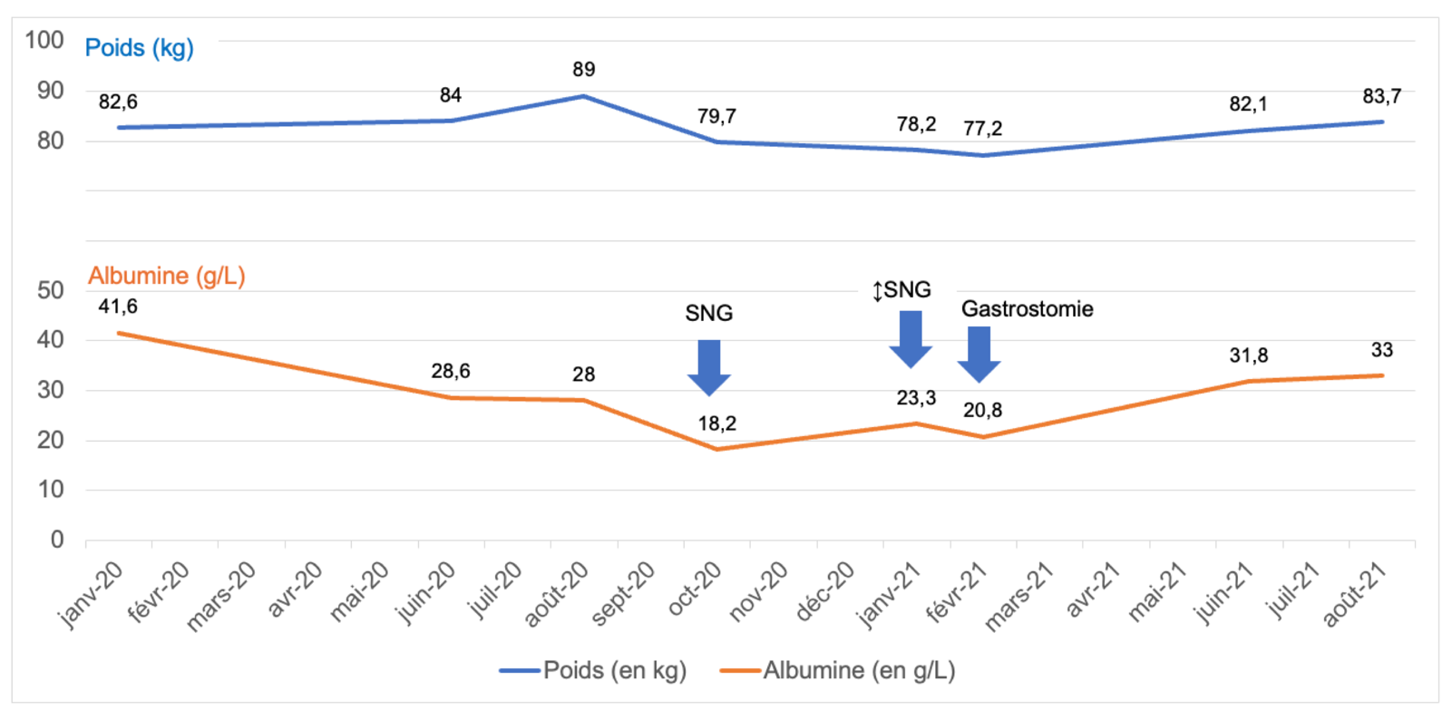 On September 14, 2021, the patient's weight was 83.7 kg, albuminemia was 33 g/L, and prealbumin was 0.35 g/L. Nutrition was provided by 1 L/day of Mégaréal® and one oral supplement per day.