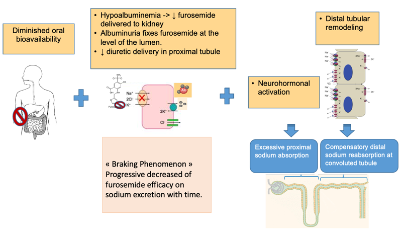 Many mechanisms have been implicated in the development of diuretic resistance. Variations in pharmacodynamics and pharmacokinetics through changes in the absorption, distribution, metabolism, and elimination of diuretics have been implicated in this resistance. The chronic administration of loop diuretics decreases sodium reabsorption from the loop of Henlé and increases the delivery of large amounts of sodium from the distal tubule. This will be responsible for hypertrophy of the tubular cells and an increase in the reabsorption of sodium responsible for a decrease in natriuresis, this phenomenon being called the “braking phenomenon” [8]( Figure 2).