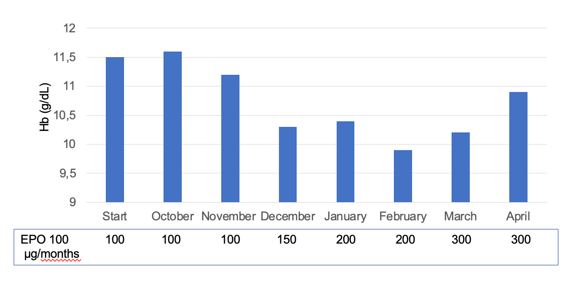 Figure 3.Evolution of the Hb (hemoglobin) level (g/dL) and the monthly EPO (darbepoetin alfa (ARANESP®)). dose month by month during pregnancy