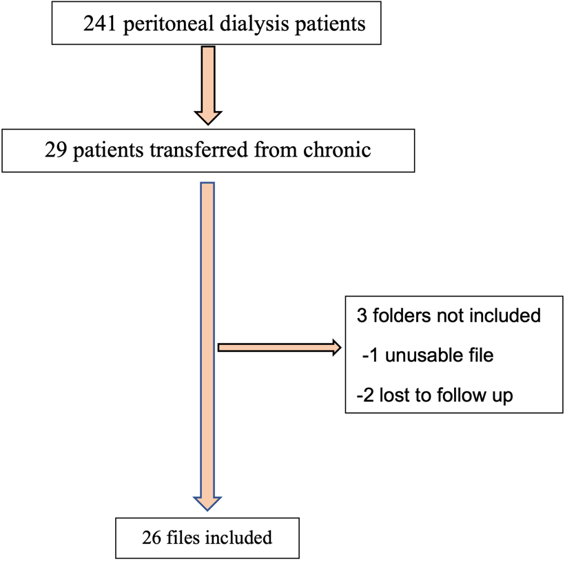 We included patients over 18 years of age who had been in chronic HD for at least 3 months and were then transferred to the PD unit. Patients whose records could not be used due to lack of data as well as patients who were lost to follow-up were excluded.