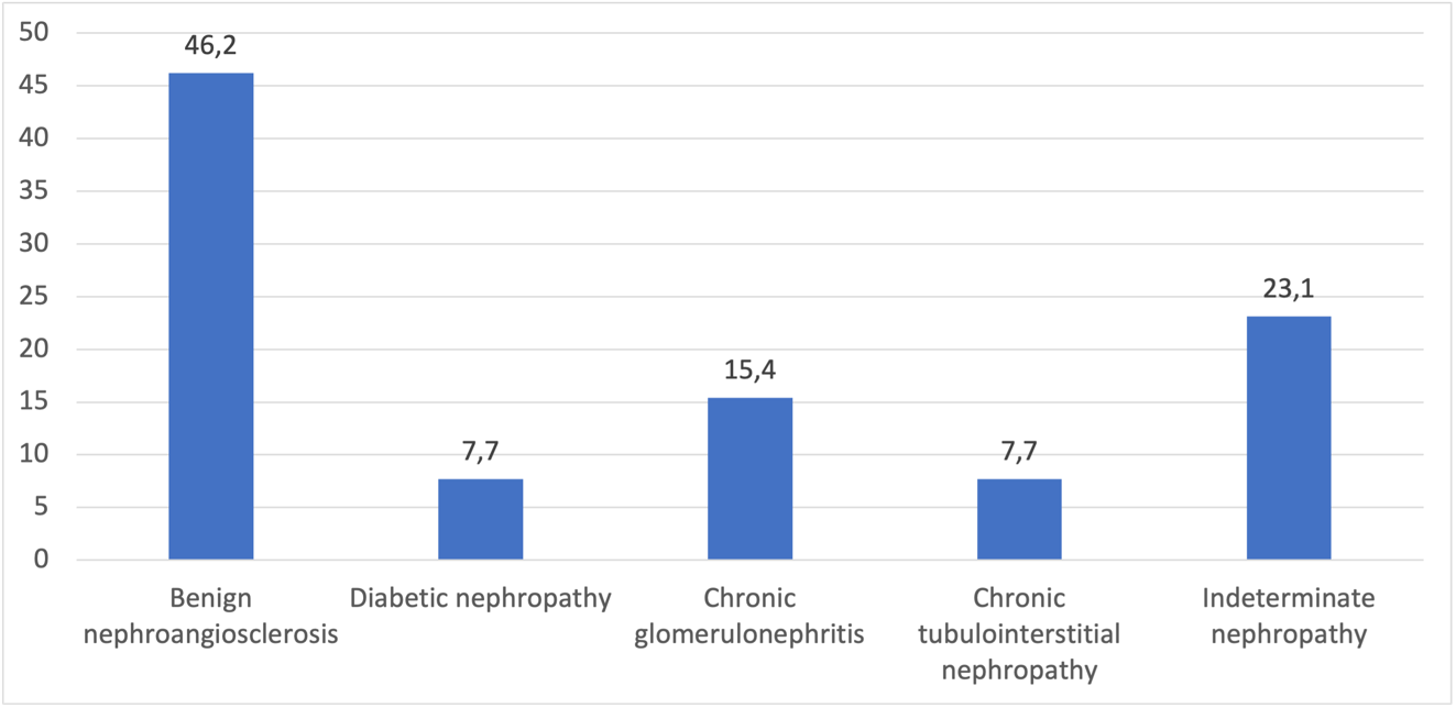 Females predominated, with a sex ratio of 0.62. Nephroangiosclerosis (NAS) was the most common nephropathy (46.2%), followed by undetermined nephropathies (23.1%) (Figure 3.).