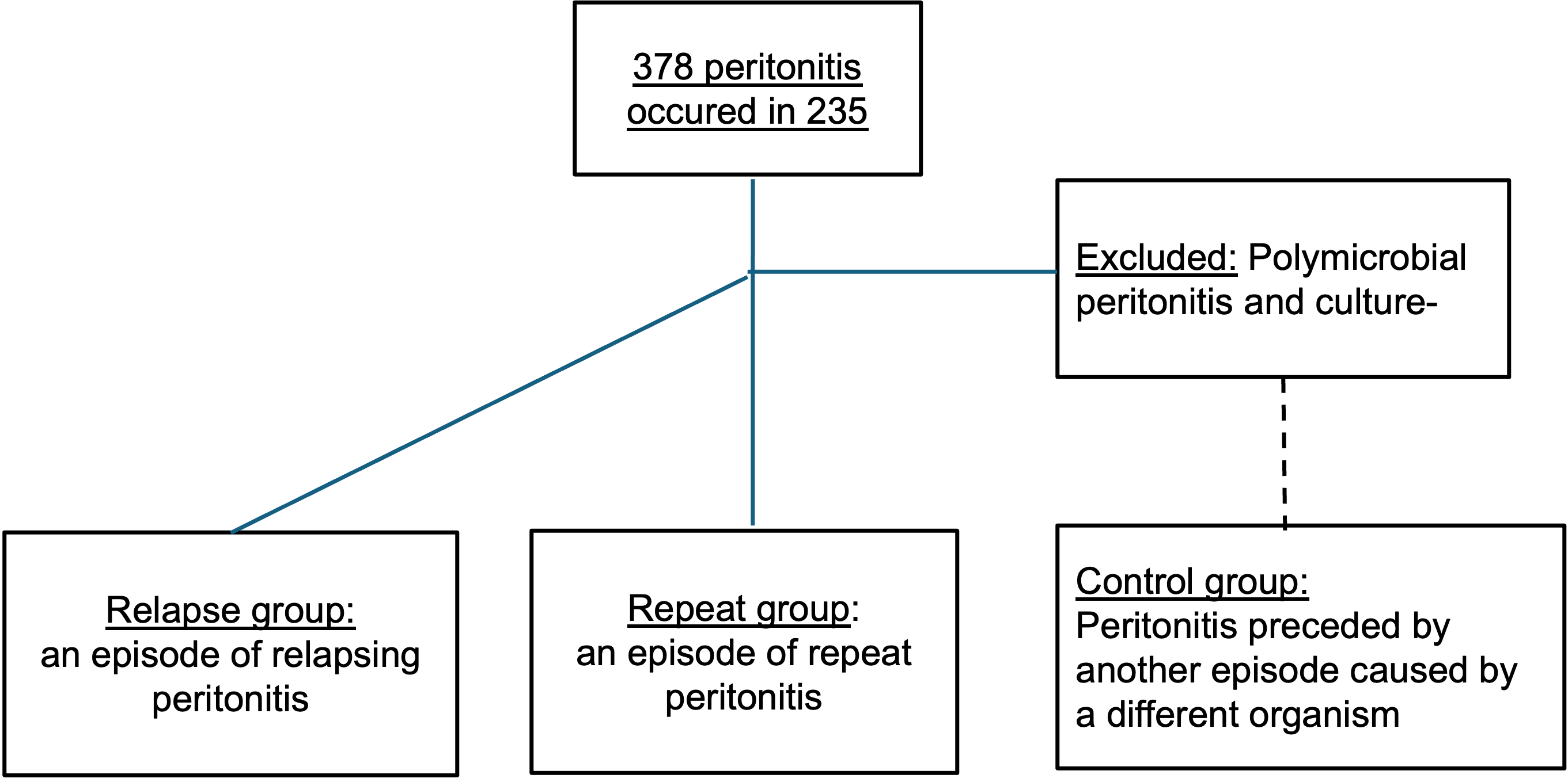 Methods: We studied the outcomes of 26 episodes of repeat peritonitis between 2006 and 2024 (Repeat Group) and compared them with 23 episodes of relapsing peritonitis (Relapse Group) and 84 episodes of peritonitis preceded by 4 weeks or more by another episode with a different organism (Control Group).
