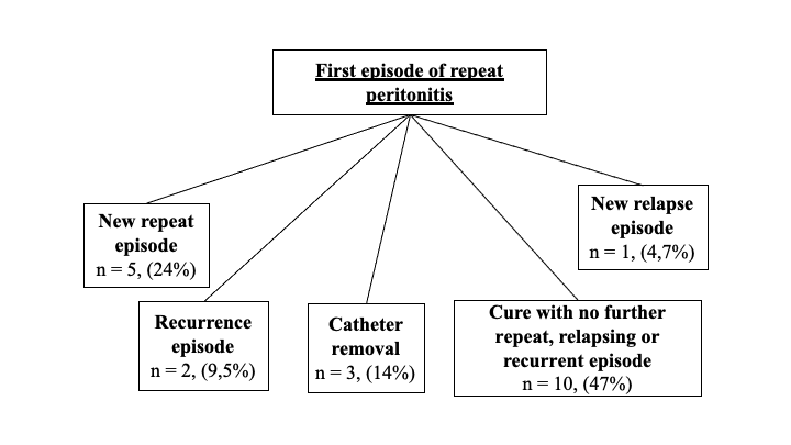 Conclusion: The definition of repeat peritonitis is clear. Despite a favorable outcome with antibiotic treatment, the risk of further episodes of peritonitis remains high, threatening the time on peritoneal dialysis therapy and the life of the patient.