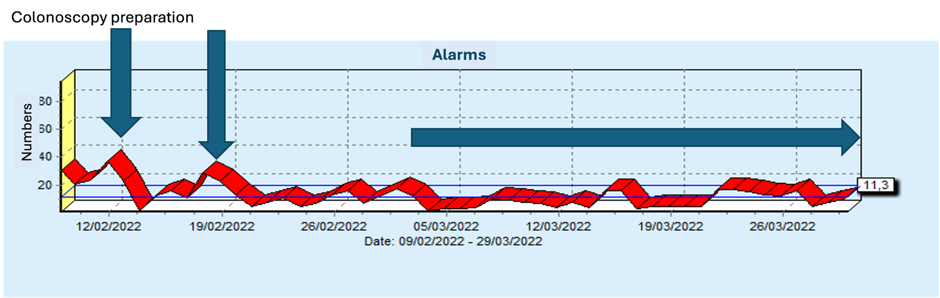 The patient was admitted to hospital on 11/02/2022 in preparation for a colonoscopy scheduled for 13/02/2022. However, due to the practitioner’s unavailability, this was postponed to 18/02/2022, and a second colonic preparation was necessary. As seen in (Figure 1.), there was a clear fluctuation in the number of alarms on the patient’s machine from February 9, 2022, to March 29, 2022: it fell sharply in the aftermath of colonic preparation, i.e., when the bowel was empty.