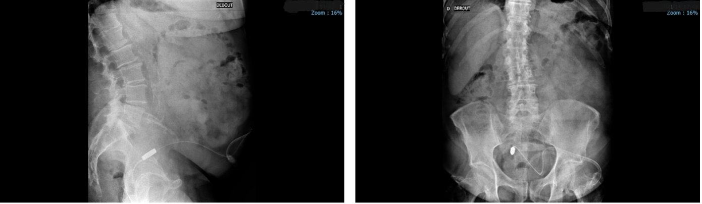 Peritoneal dialysis began in October 2020 in APD using the Harmony® FRESENIUS cycler (with a standard program of 4 cycles of 2.3 L and 120 minutes of stasis; the authorized residual volume was prescribed at 630 ml). Abdomen without preparation (AWP) radiography performed at the start of treatment showed a significant stercoral overload with correct catheter positioning (Figure 2.). Constipation was, therefore, present at the time of treatment.