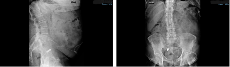 La dialyse péritonéale a débuté en octobre 2020, en DPA au moyen du cycleur Harmony® FRESENIUS. (Avec un programme standard de 4 cycles de 2.3 L,120 minutes de stase ; le volume résiduel autorisé est prescrit à 630 ml). L’abdomen sans préparation (ASP) réalisé en début de traitement a montré une surcharge stercorale importante avec un positionnement correct du cathéter ( Figure 2). Il existait donc une constipation présente au moment de sa prise en charge.