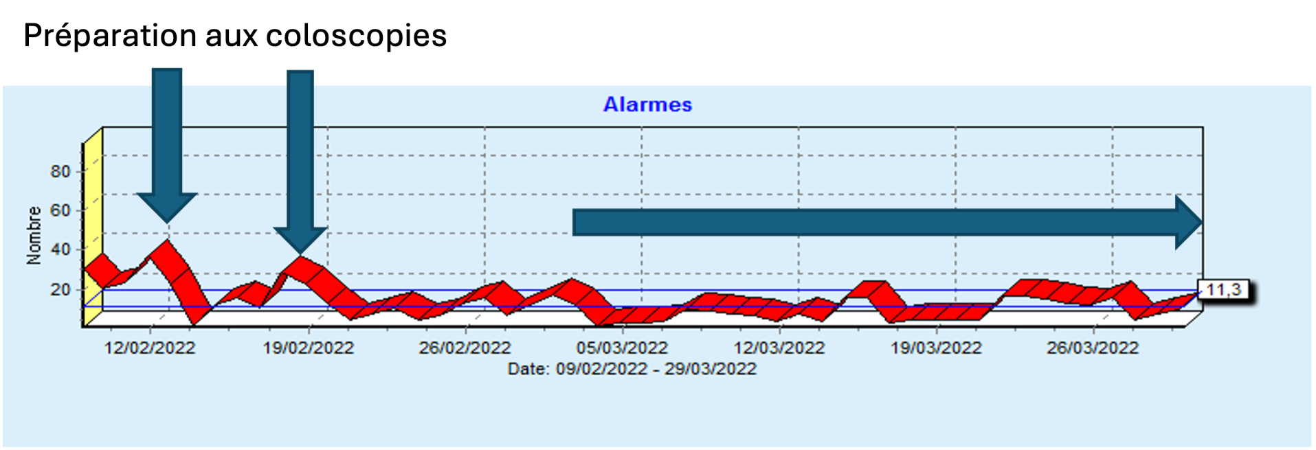 Il s’agit d’une femme, âgée de 81 ans avec un indice de masse corporelle (IMC) de 26,3 kg/m 2 (poids 81 kg, taille 1,70 m). Son programme était de 6 cycles dont 2 avec 1,9 L pendant 40 minutes et 4 cycles de 2,6 L pendant 90 minutes. La patiente a été hospitalisée le 11/02/2022 pour préparation à une coloscopie qui devait être réalisée le 13/02/2022. Celle-ci a été repoussée au 18/02/2022 suite à une indisponibilité du praticien et une 2ème préparation colique a été nécessaire. L’enregistrement du nombre d’alarmes de la machine de la patiente sur la période du 12 février 2022 au 29 Mars 2022 a mis en évidence une nette fluctuation de leur fréquence de survenue : Le nombre d’alarme diminuait fortement dans les suites de la préparation colique, donc lorsque l’intestin était vide ( Figure 1).