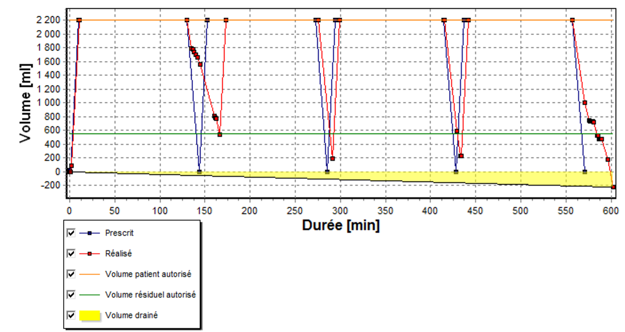 La quasi-totalité de nos patients sont traités en dialyse péritonéale automatisée (DPA) au moyen du cycleur Harmony® du laboratoire Fresenius. Ce cycleur permet de visualiser graphiquement la cinétique d’introduction et drainage du dialysat lors des cycles de renouvellement, ainsi que les alarmes provoquées par une diminution de débit.