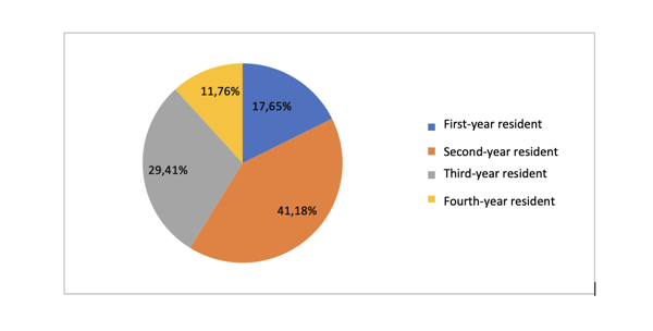 Thirty-four physicians (77.27%) who responded to the questionnaire are residents. The distribution of residents according to residency year is shown in Figure 1.
