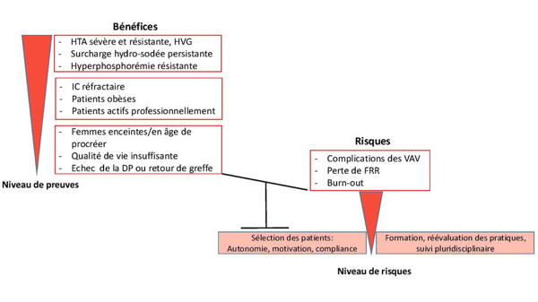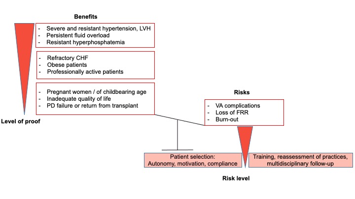 Similarly to the benefits, the risks of HHD are essentially related to the intensity of dialysis. These risks are mainly increased vascular access (VA) complications, loss of RRF, and patients’ exhaustion, sometimes associated with that of their caregivers. Some of these risks can be prevented and must be balanced against the expected benefits of IHHD.
