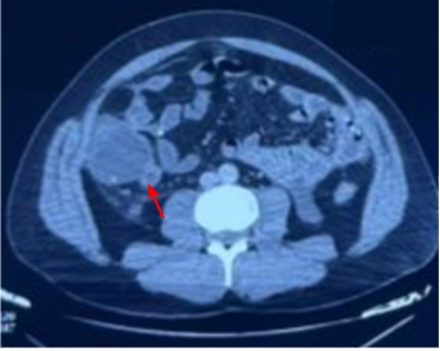 Figure 1:CT scan image confirming the diagnosis of acute appendicitis (red arrow)