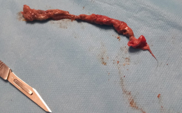 Histologically, the anatomopathological examination revealed an enlarged latero-cecal appendix, with an 11-mm-thick stercolith and adjacent fat infiltration. The cytobacteriological analysis revealed a positive culture for Escherichia coli and Group B Streptococcus. Given the lack of clinical improvement and persistent febrile syndrome, the antibiotic therapy was changed to ertapenem. Peritoneal dialysis was resumed with small volumes 72 hours later, without reliance on hemodialysis. Antibiotic therapy was maintained for a total duration of three weeks. The patient’s condition showed clinical and biological improvement, and no recurrence of peritonitis was noted after one year of follow-up.