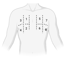 Figure 1.8-site scanning protocol. Each hemithorax is divided vertically by the midclavicular line and horizontally by the 3rd intercostal space