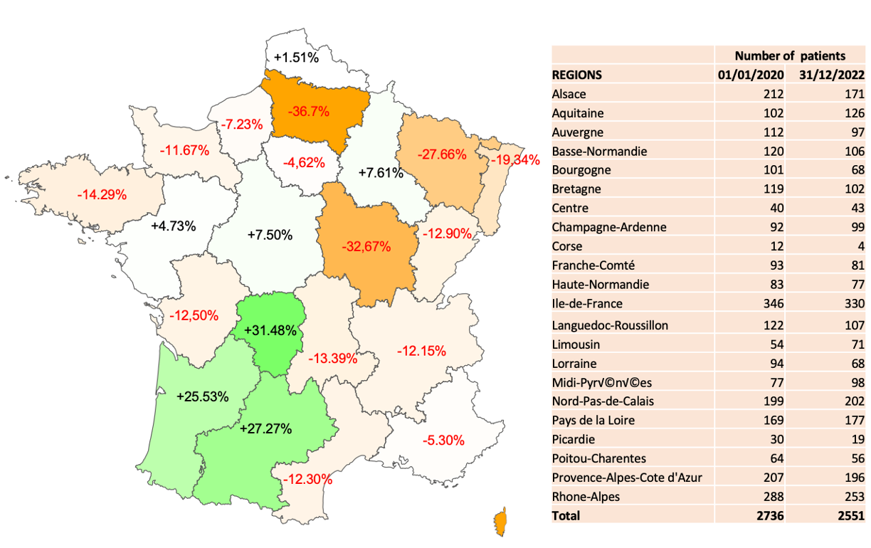 Figure 1:Percentage variations in the number of patients treated with PD in France, in its various regions, between January 2020 and the end of December 2022