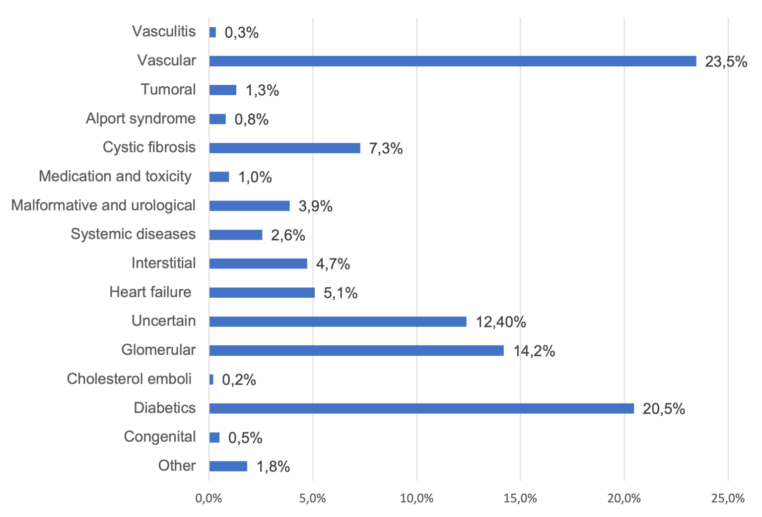 Vascular (23.5%) and diabetic (20.5%) nephropathies are the most numerous.