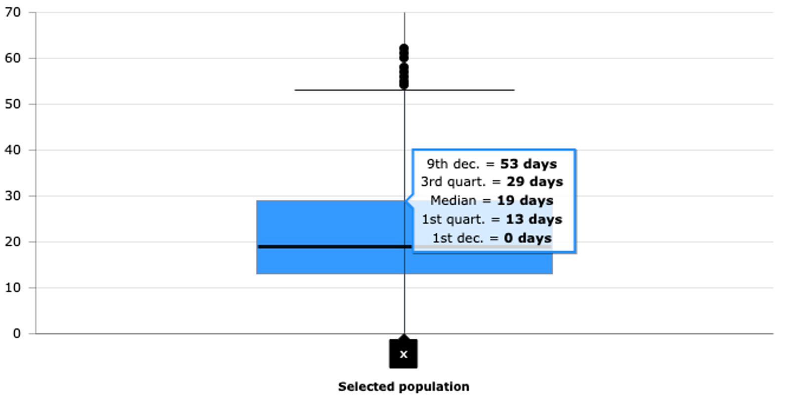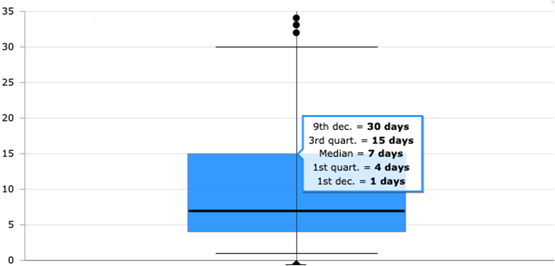 Figure 9.96,7 % des patients ont été formés après la pose du cathéter et 3,3 % avant. Parmi ceux formés après la pose du cathéter , le délais entre pose et début de formations est très variable, avec une durée médiane de 19 jours