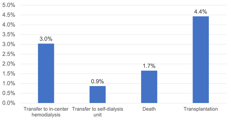 Of the patients, 11% have received peritoneal dialysis in the past. Of these, 23.5% transitioned to home hemodialysis less than 3 months after stopping peritoneal dialysis, while 23.6% transitioned after 2 years of center-based or self-administered hemodialysis.