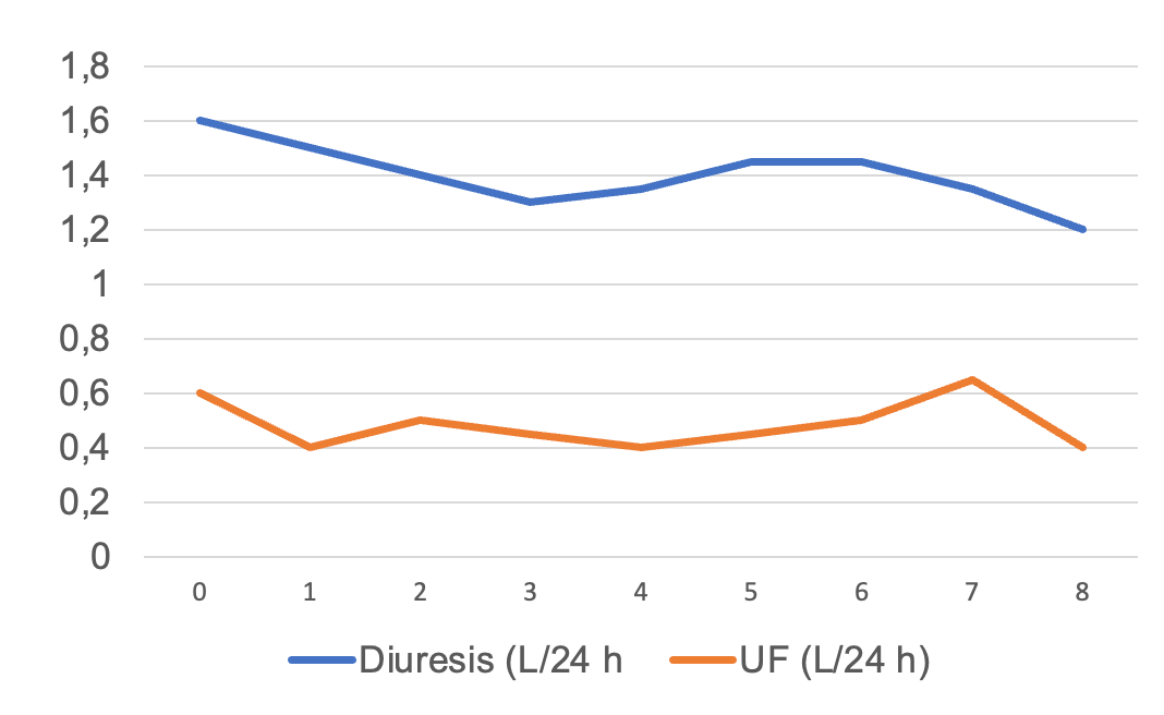 Ultrafiltration consistently averaged approximately 600 mL per day, while residual diuresis was sustained at about 1500 mL per day (Figure 2.). The monthly weight gain was consistently around 1 kg.