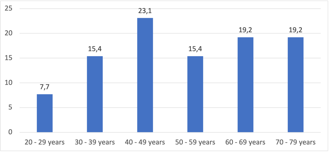 The mean age of patients was 52.19±15.37 years, with extremes of 25.00 and 79.00 years. The majority of patients were in the 40–49 age bracket (23.1%) (Figure 2.).