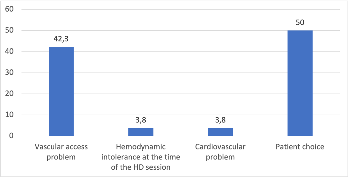 The most frequent reason for transfer was personal choice, which was the case for 13 patients (50.0%), followed by vascular access problems (hemodialysis vascular impasse) for 11 patients (42.3%) (Figure 4 Representation of the 26). The personal choice was related to professional activity, the non-existence of hemodialysis in the place of residence, and the absence of social security to continue private hemodialysis due to a lack of available space in the public sector. Concerning the circumstances surrounding PD initiation, 18 patients (69.2%) were admitted due to an emergency situation, compared with 30.8% who were scheduled for PD. Of the emergency PD patients, 11 had vascular impasses and 7 chose PD for personal reasons (including 5 for reasons of distance from the HD center and financial problems). Among the scheduled patients, six were related to personal reasons, one to cardiovascular instability, and one to hemodynamic intolerance.