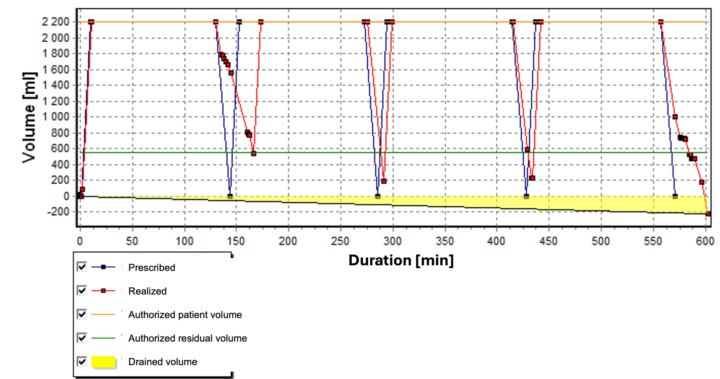 The patient was 81 years old and had a body mass index (BMI) of 26.3 kg/m2 (weight 81 kg, height 1.70 m). Her program consisted of 6 cycles, including 2 cycles of 1.9 L for 40 minutes and 4 cycles of 2.6 L for 90 minutes.