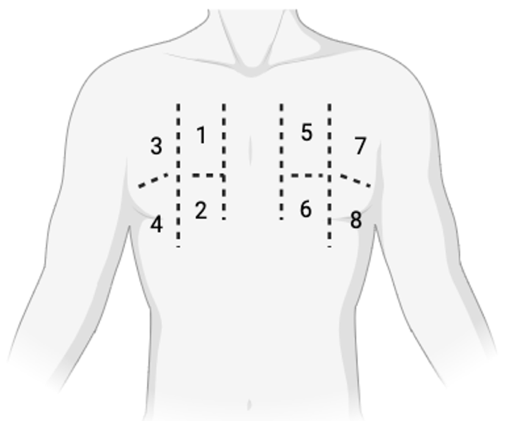 Figure 1.8-site scanning protocol. Each hemithorax is divided vertically by the midclavicular line and horizontally by the 3rd intercostal space