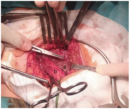 Figure 2.Figure 2. Hernioplasty according to the Lichtenstein technique. a: Polypropylene mesh, b: Spermatic cord