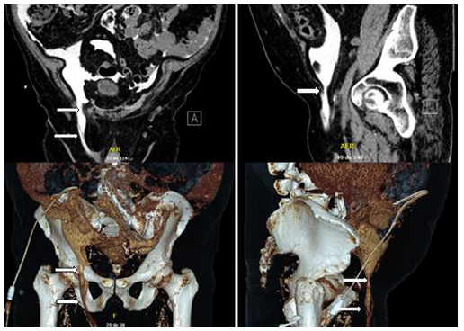 Figure 1.Figure 1. CT-peritoneography with 3D reconstruction showing genital leakage associated with right PPV.