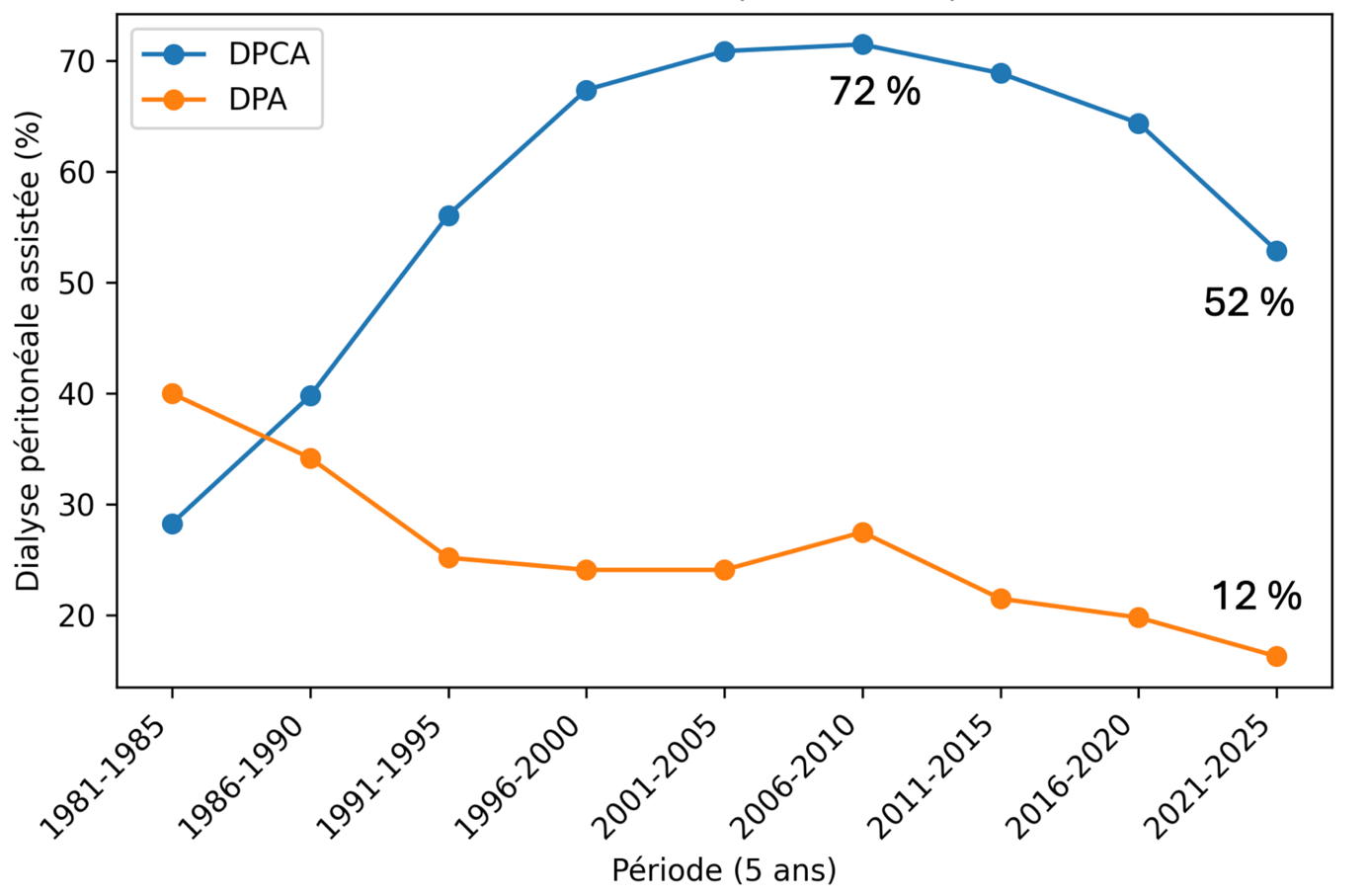 Le recours à une assistance a été essentiellement utilisé pour les patients traités par DPCA avec un maximum entre les années 2006 et 2010, pour diminuer ensuite progressivement tout en restant proportionnellement supérieur à ceux en DPA. L’utilisation d’une assistance en DPA n’a été supérieure à celle en DPCA, en pourcentage, que dans les années quatre-vingts (Figure 1).