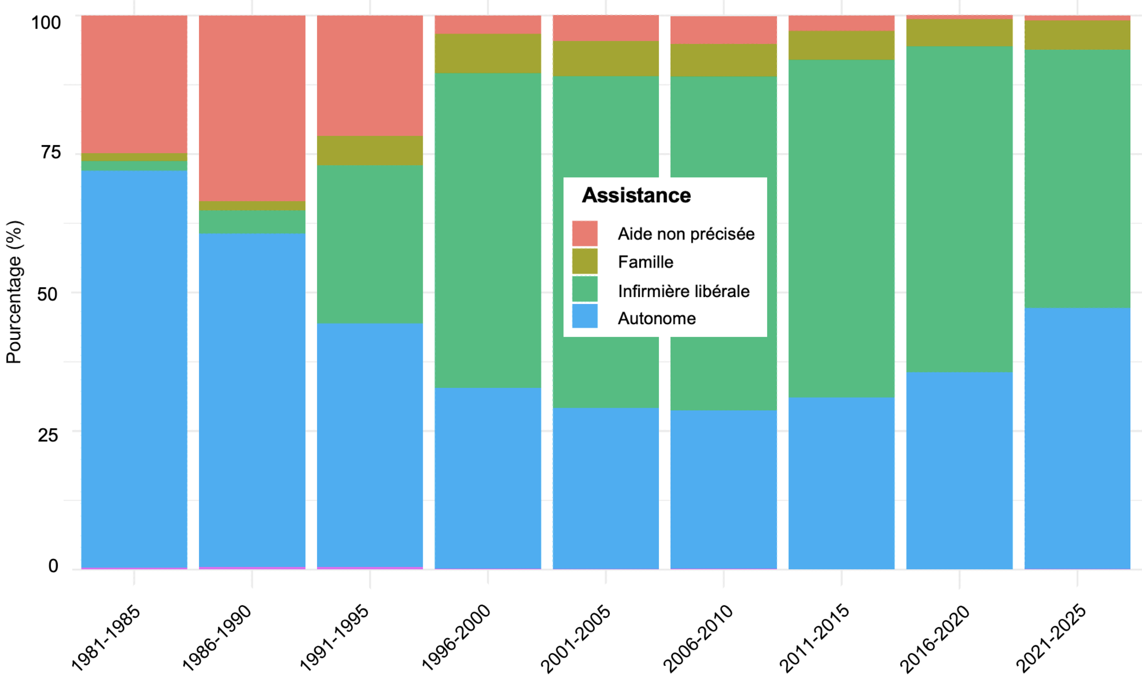 L’aide est principalement réalisée par des infirmières libérales, le recours à la famille restant marginal. Néanmoins, que ce soit en DPCA ou DPA le pourcentage de patient autonome augmente dans la prise en charge, particulièrement dans la dernière période (Figure 2 et Figure 3). Au cours de cette dernière période, l’incidence des patients a diminué tant en DPCA qu’en DPA.