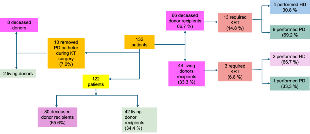 Among patients who underwent living donor KT (n = 44), two (4.5%) had their PD catheter removed during KT surgery. Of those who retained their catheters, six patients (13.6%) experienced infectious complications, all of which were exit-site infections, including two cases with pre-existing PD infections. Three patients (6%) in this subgroup required KRT, with one utilizing the PD catheter due to graft failure and two requiring hemodialysis.