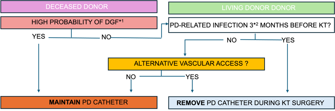 Living donor KT is typically a planned procedure with a lower risk of DGF. As such, the threshold for removing the PD catheter during surgery should be low, particularly in patients with no history of recent PD-related infections or those with alternative dialysis access.