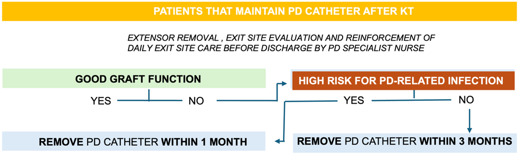 We propose a pragmatic, risk-based algorithm intended to support individualized decision-making regarding PD catheter management after KT, prioritizing a patient-specific approach that considers donor type, prior infection history, and alternative dialysis access. While further research is needed to validate this approach, we hope this algorithm provides a valuable framework for optimizing outcomes during the transition from PD to KT.