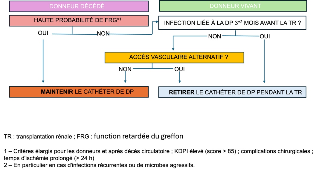 Discussion: These findings support individualized decisions regarding peritoneal dialysis catheter removal, particularly for patients with a low risk of delayed graft function. A risk-based decision algorithm is proposed to assist clinicians. Although current practice aligns with existing guidance, the infectious risks linked to maintaining the catheter suggest that earlier removal should be considered. A tailored approach may improve clinical outcomes and facilitate a safer transition from peritoneal dialysis to kidney transplantation.
